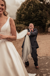 Alice (bride) went for a true #bride dress, simple and elegant, this style 'Austin' is a true beautiful classic. Purchased from https://whiteboutique.co.uk/ glamorous and chic this on the shoulder gown has a beautiful plunge front neckline bodice with a deep v-neckline to the back. This #bridal gown has the biggest super chic full circular Mikado skirt with pockets. Finished with a covered buttons from top of the bodice to the skirt hem over zip closure.